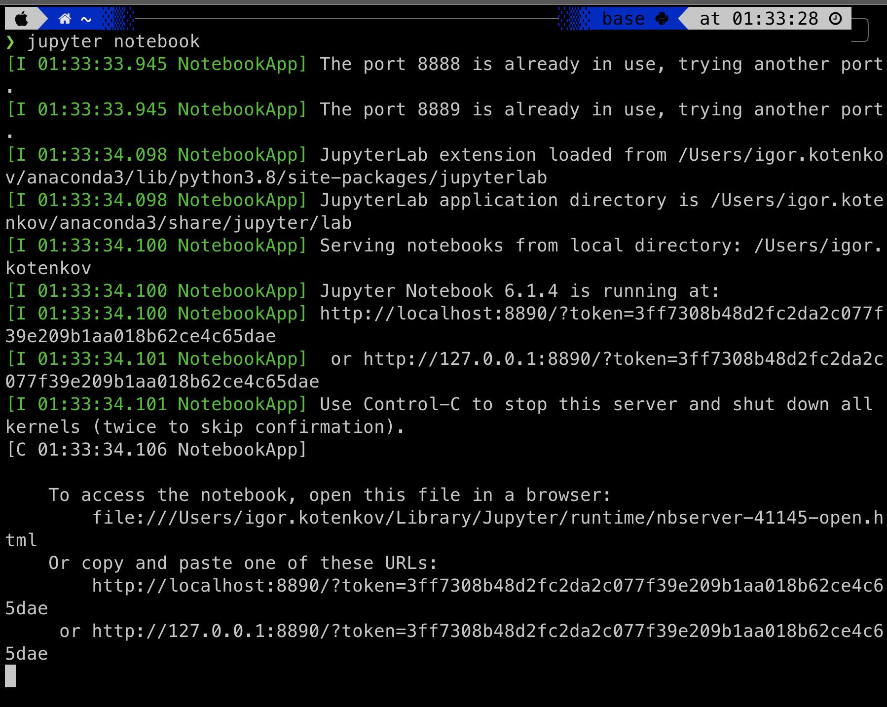 Перейдите по одной из ссылок (если не перекинула само), в которых есть слово token – они начинаются с http://localhost или http://127.0.0.1. В браузере откроется страница с обзором директории, из которой был запущен Jupyter Notebook. Если в дальнейшем хотите хранить все свои результаты в другом месте, то перед запуском команды с помощью уже указанной инструкции в терминале cd <путь/до/директории> перейдите к ней.