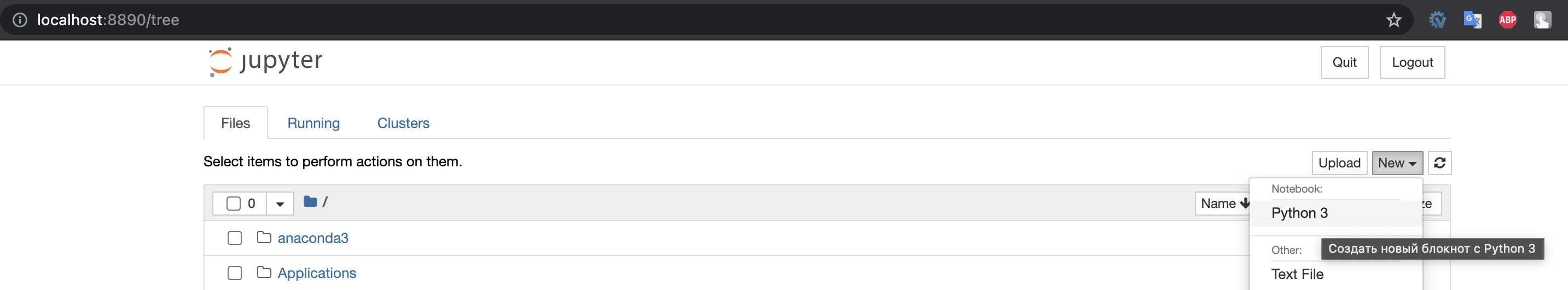 Для создания нового файла – блокнота, как его еще называют («почему?», – узнаете в следующей лекции) – кликните по кнопке New в правом верхнем углу, а затем – по Python 3 (возможно будет какая-нить приставка, это штатно).